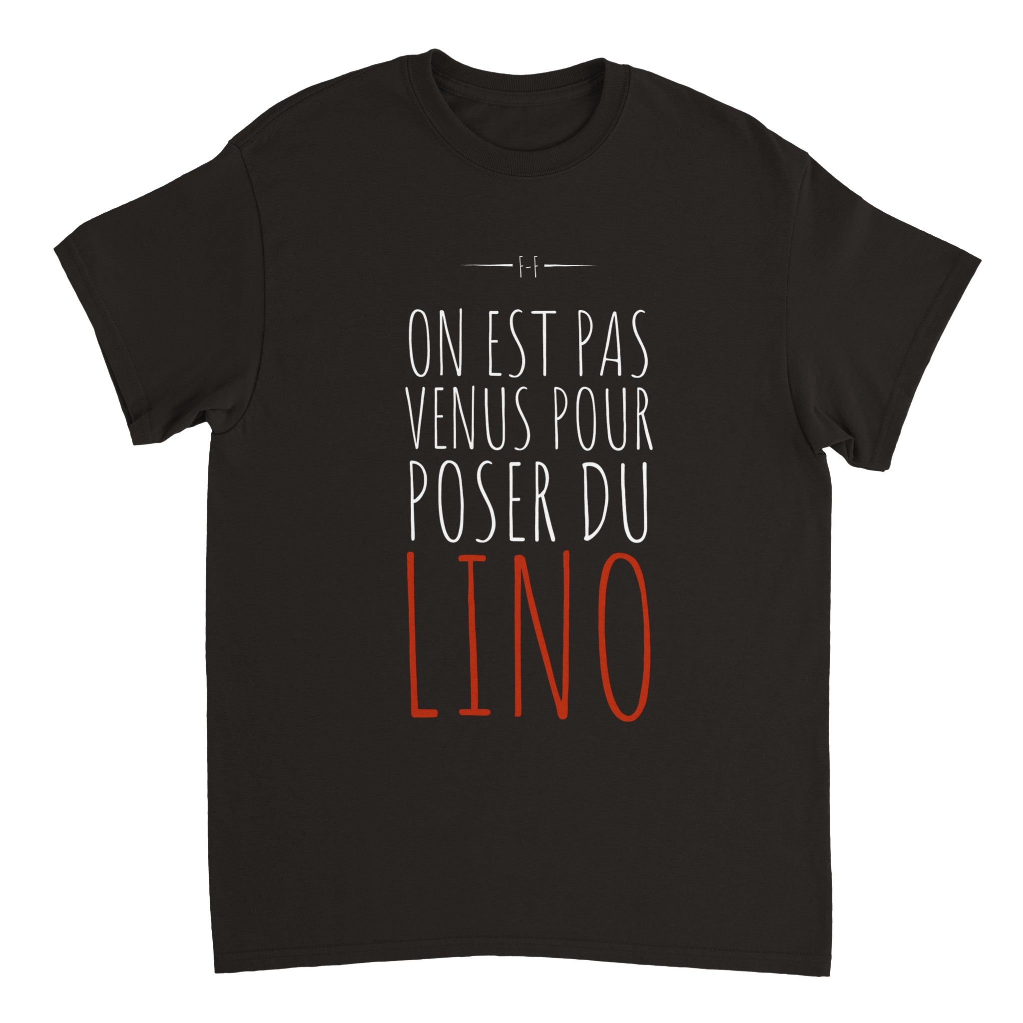 Ajoutez une touche d'humour à votre garde-robe avec notre t-shirt "On est pas venus pour poser du lino". Soyez prêt à déclencher des sourires et des conversations partout où vous irez.